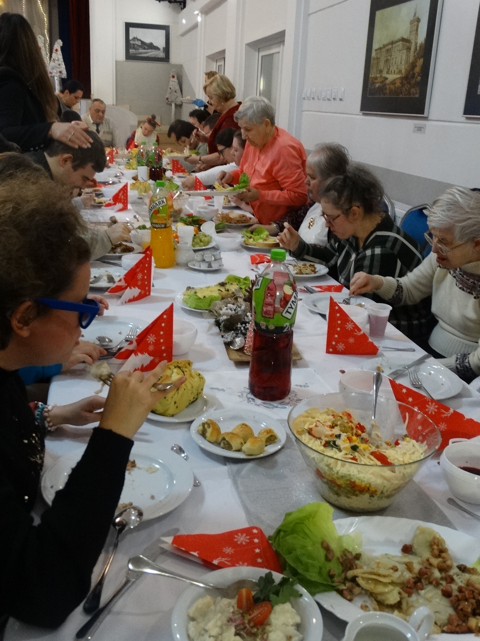 W tym dniu nie mogło zabraknąć wigilijnych potraw przygotowanych przez pracownię kulinarną i gospodarstwa domowego. Spotkanie umilił występ artystyczny przygotowany przez podopiecznych, który chwytał mocno za serca. Występujący zostali nagrodzeni gromkimi brawami za trud i zaangażowanie jakie włożyli w przygotowanie występu.